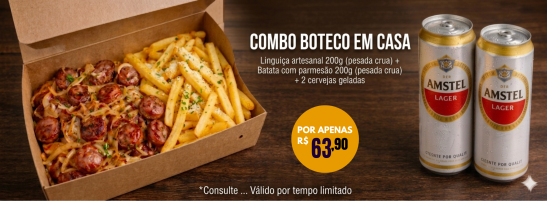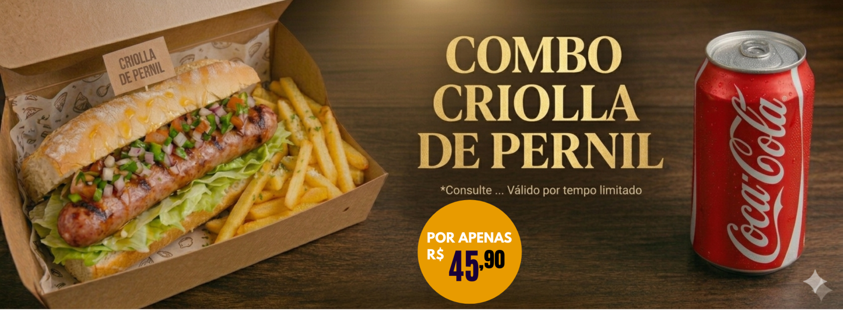 Baguete de 17 cm recheada com linguiça artesanal de pernil, produzida pela charcutaria, combinada com muçarela e queijo coalho, finalizada com molho chimichurri. Acompanha batata frita (70g) e refrigerante em lata 350ml.